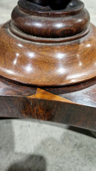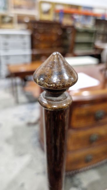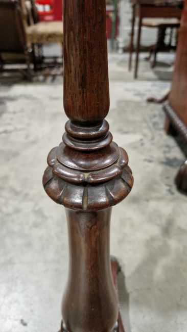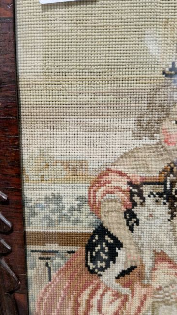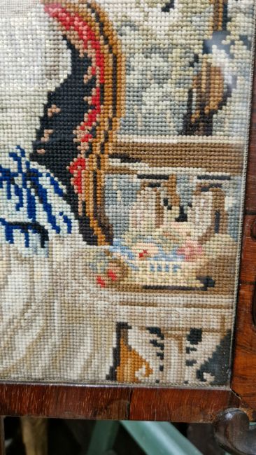 19th century rosewood pole screen, the adjustable rectangular screen having a foliate scroll moulded frame and needlework panel depicting a lady, child and dog, on a turned and carved fluted column and platform base with three scrolling feet, 150cm high x 52cm wide  Condition Report Surface scratches, scuffs and knocks. Some areas of fading/discolouration. Appears to be a repair or split to top left corner of screen. Small areas of loss and small repair to veneer on base. Joints are sound. General wear and tear. No damage to needlework, possibly some fading/discolouration. Screen dimensions - 45cm x 40cmPole diameter - 2cm