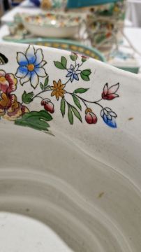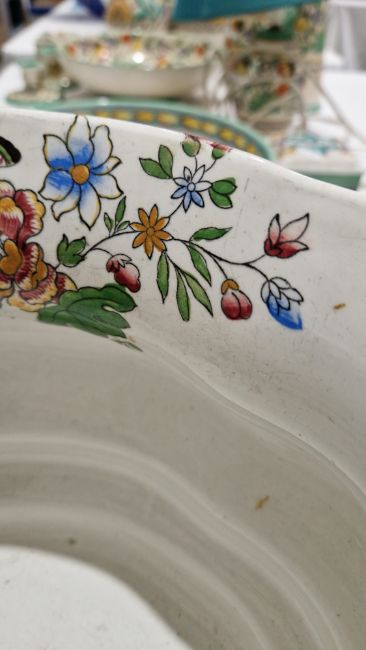 Surface scratches, marks and accretions. Chip to rim, hairline to base. General wear and tear.