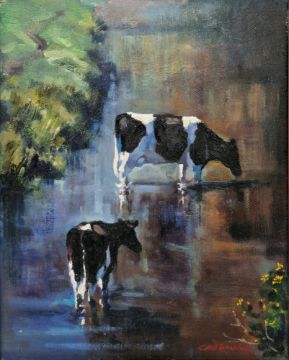 Claire Verity (20th century) Oil on canvas Cattle watering, signed lower right, 25cm x 20cm, together with an oil on panel by the same hand depicting cattle watering, signed lower left, image size 19cm x 29cm (2)