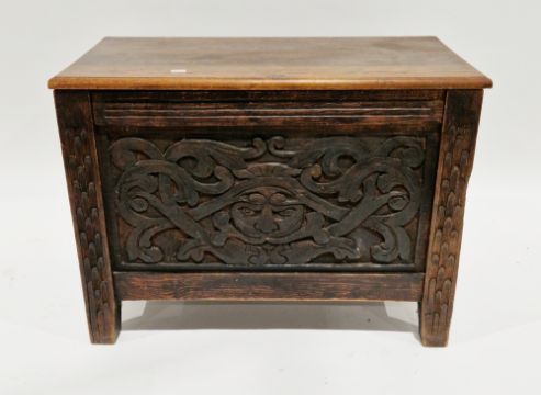 18th/19th century oak coffer, the hinged rectangular lid with thumbmoulded edge, the front panel carved with a face mask and foliate strapwork, carved panels to sides, on style feet, 54cm high x 73cm wide x 42cm deep