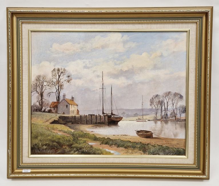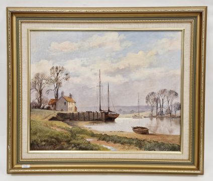 Don Micklethwaite (British, b.1936) Oil on canvas River scene with moored boats and dwelling, signed lower left, 41cm x 51cm