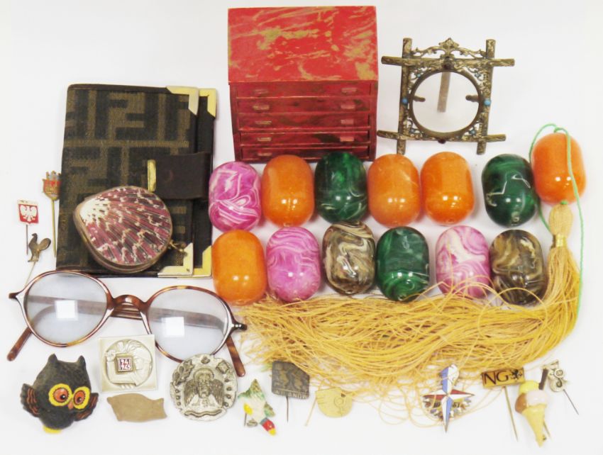 Mixed lot including collection of thirteen vintage coloured plastic beads, 3.5cm long together with a easel back gilt metal photograph frame, enamel Festival of Britain badge, oriental style doll's house chest of drawers and other items