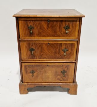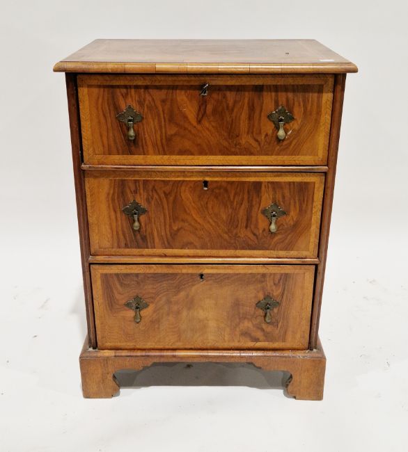 19th century George III revival walnut and crossbanded bachelor's chest of three long drawers, having metal drop handles, on bracket feet (with key), 76cm high x 55cm wide x 43cm deep