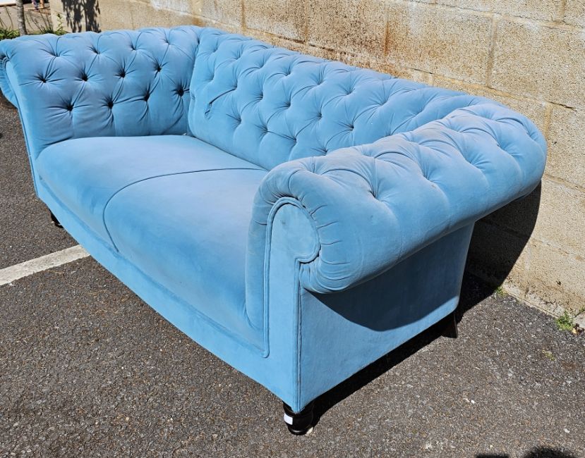 Blue dralon two-seater Chesterfield settee, button upholstered and on turned supports, approximately 196cm wide by 92cm deep