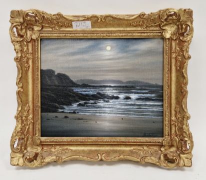 Bob Tucker (British, b. 1951) Oil on canvas "Goodrington Sands, Paignton, Devon", Coastal scene by moonlight, signed lower right, titled and dated 1996 verso, 20.5cm x 25cm, together with another oil on canvas by the same hand "Fingle Bridge, Dartmoor", signed lower right, titled and dated1996 verso, 20.5cm x 25cm (2)