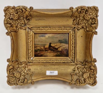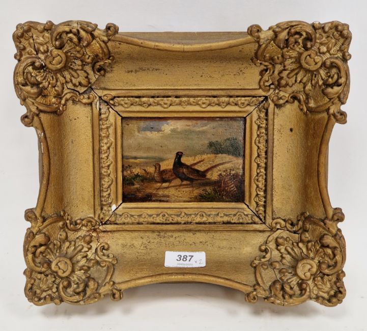 J. Chav?? Early 19th century school Oil on panel English pointer in landscape, indistinctly signed lower right, framed, 9cm x 12cm, together with a 19th century oil on panel depicting two pheasants in landscape, unsigned, 9cm x 12.5cm (2)