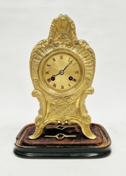 Late 19th/early 20th century French gilt metal mantel clock in the rococo style, the gilt face with roman numerals and two winding holes, the movement stamped Carcel Paris 1095 (with two keys), 25cm high housed in a glass dome on ebonised base