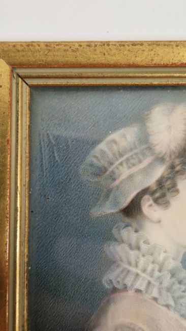 English School, late 18th/early 19th century Portrait miniature on ivory, of a lady in profile to the right, wearing a plumed hat, white ruff, pale pink dress and blue shawl, labelled verso 'E.A. (de Beaufort) St. Lawrence, Wife of The Hon. Thomas St. Lawrence, Bishop of Cork', 7.6cm x 5.8cm. Ivory exemption reference: LX1BPX5Z. Condition Report Appears to be some surface scratches around bust and back of shoulder. No obvious chips or cracks. Does not appear to be warped. Some accretions on underside of glass. Frame in good condition. General wear and tear.