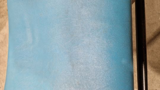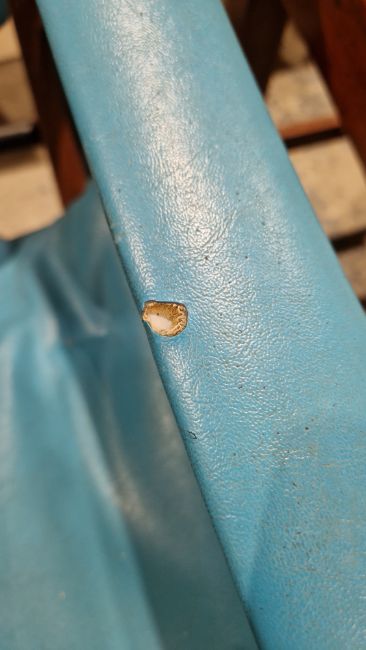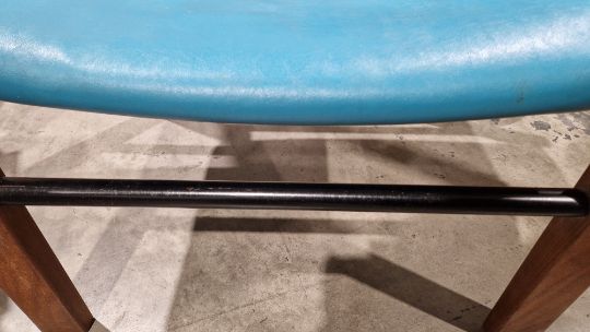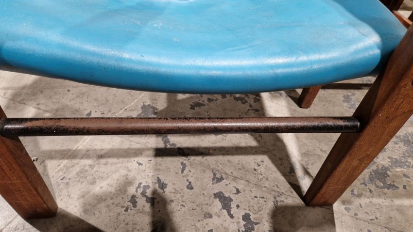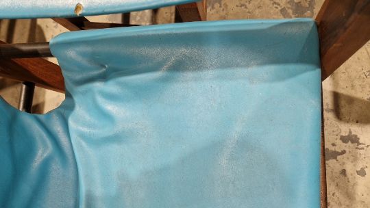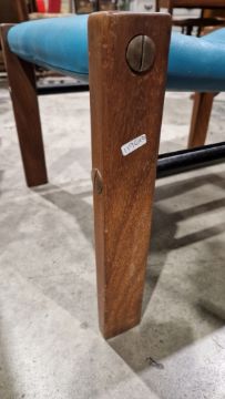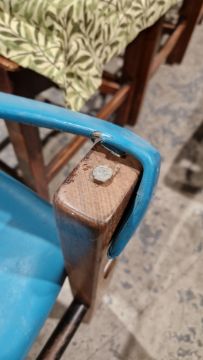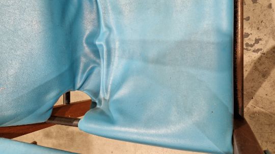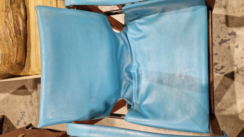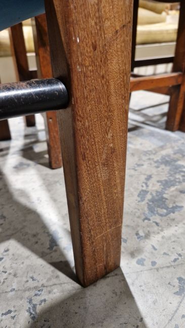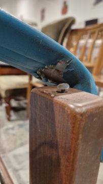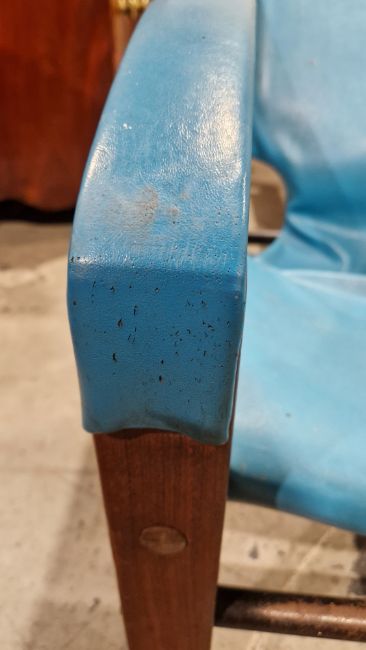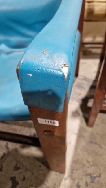 Surface marks, scuffs and accretions to wood and upholstery. Chair has two holes to upholtery on left arm, both arms detached from front legs with tears to upholstery in that area. Metal stretchers with wear and loss of paint. Some play in joints. General wear and tear.