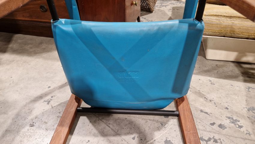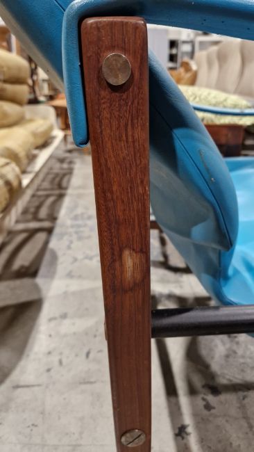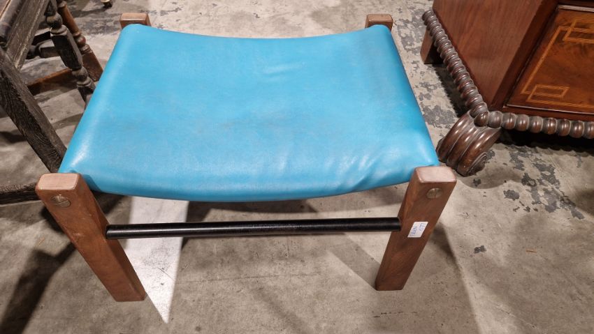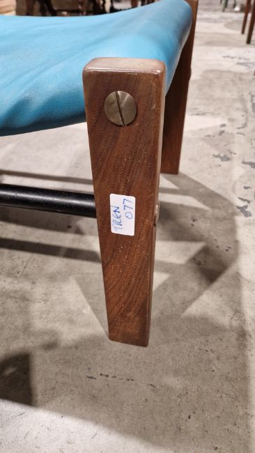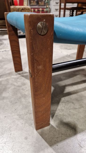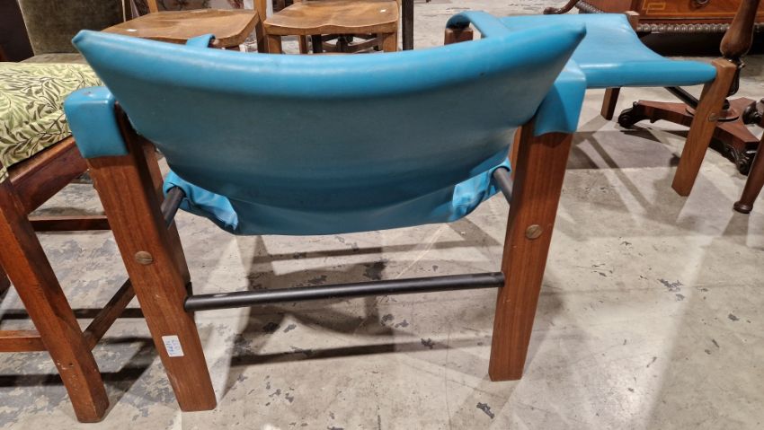 Maurice Burke for Arkana mid-20th century Safari chair and matching footstool upholstered in a blue leatherette, on a teak and tubular metal frame, chair 67cm high x 62cm wide x 70cm deep (2)