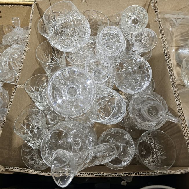 Quantity of cut and moulded glass including Thomas Webb cognac glasses, Royal Brierley wine glasses and other items (2 boxes)