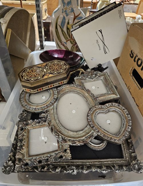 Quantity of modern photograph frames of various sizes, two modern enamelled metal bowls, inlaid marquetry trinket box, etc (1 box)