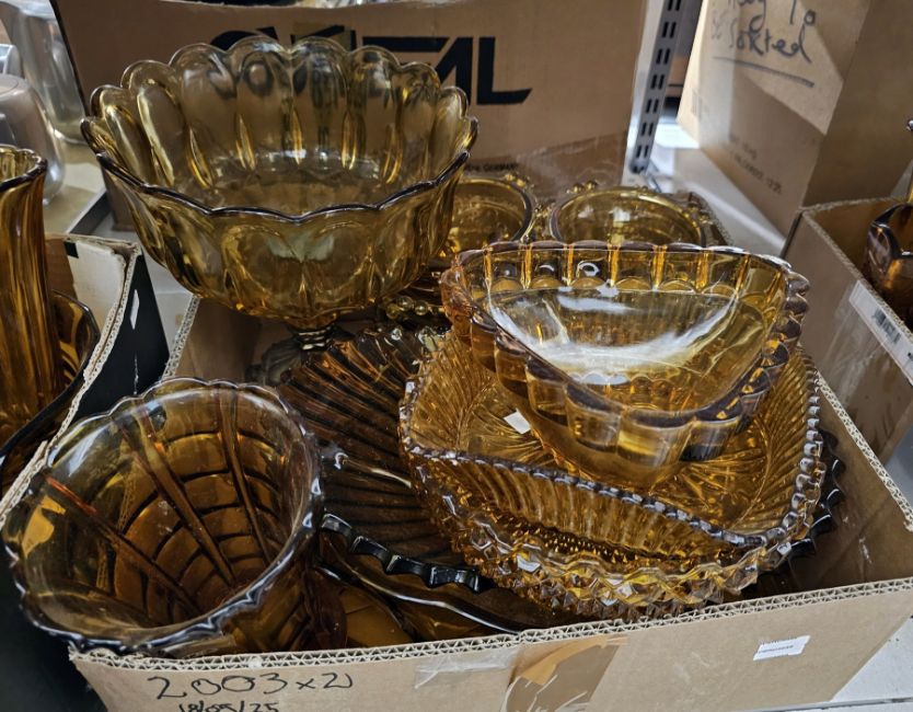Quantity of carnival glass including golden amber bowl on glass and gilt metal pedestal stand, an amber glass footed bowl and other vases, bowls, dishes, etc (2 boxes)