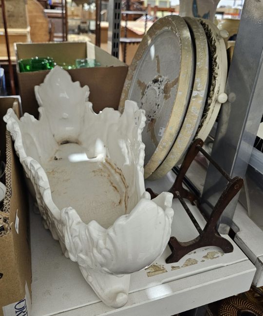 Large white ceramic acanthus decorated centrepiece, quantity of Booths Floradora plates in various sizes, matching teacups and saucers, a cream and gilt decorated circular mirror and other items (2 boxes plus)