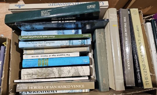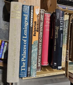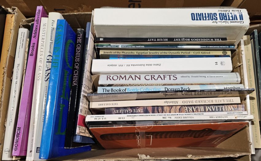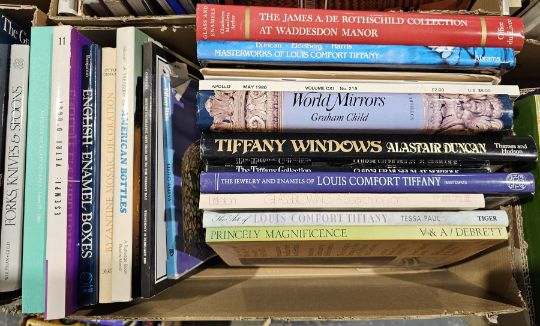 Large quantity of books many relating to the history and collection of glass to include Child, Graham "World Mirrors" printed by Sotheby's, Duncan, Alistair "Tiffany Windows", "The Treasure of American Bottles", Tait, Hugh (ed) "5,000 Years of Glass", Beck, Doreen "The Book of Bottle Collecting", Schroder "The Gilbert Collection of Gold and Silver", published by Los Angeles County Museum of Art, Thames & Hudson ( 4 boxes)