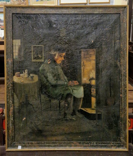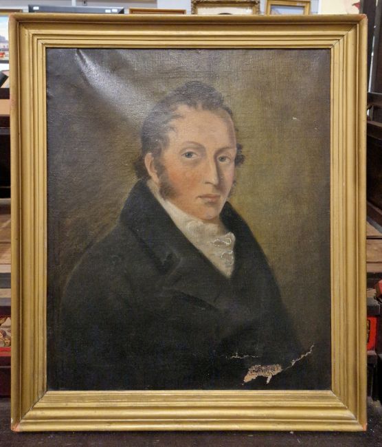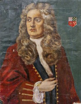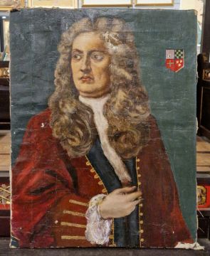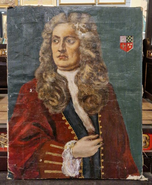 Oil on canvas portrait of 6th Duke of Buckingham, a 19th century portrait of a gentleman and a further late 19th century painting of a man tending a stove (3)