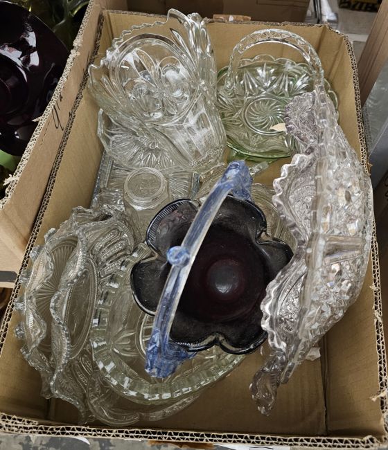 Quantity of glassware including a large studio glass vase, blue pouring jug, bowls, dishes, etc (2 boxes)