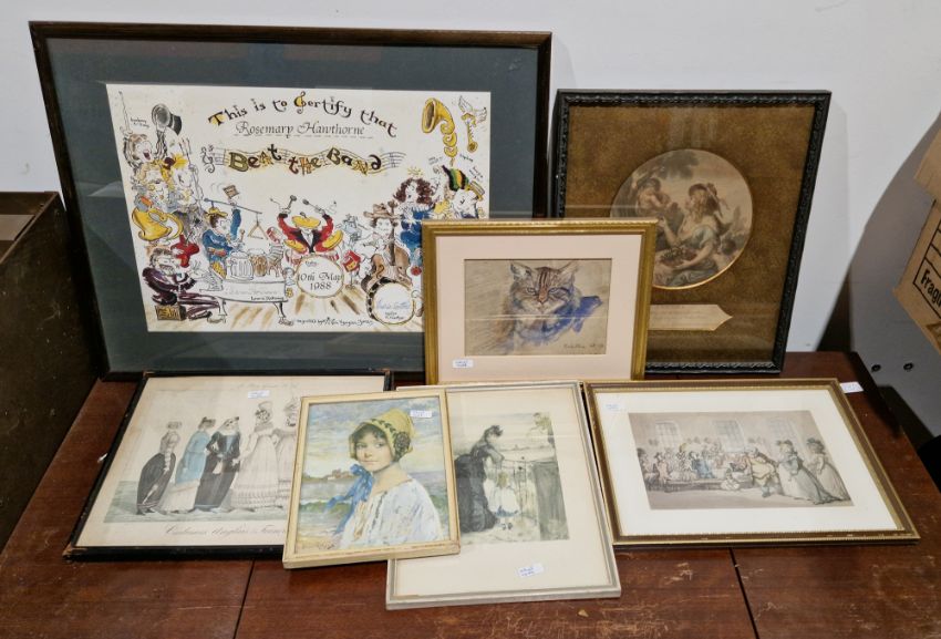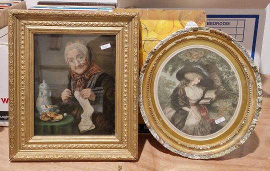 Box of framed prints and engravings, a stipple engraving, an engraving after George Morland by JR Smith of a lady reading within giltwood frame, titled 'Delia in the Country', published 1788, an engraving titled 'The Frail Sisters' after JR Smith engraved by I Hogg and others