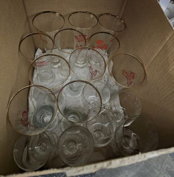Eleven Carlsberg beer glasses with gilt rims, five Guinness glasses and a quantity of drinking glassware including brandy balloons and cocktail glasses (2 boxes)