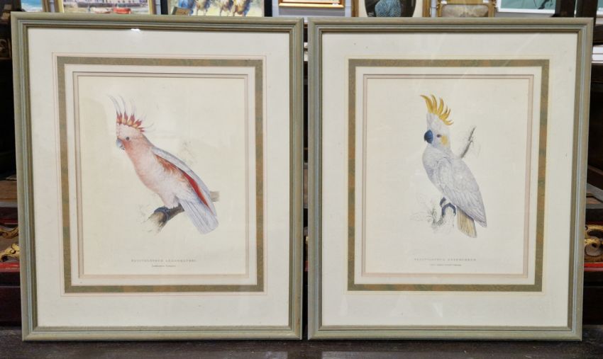 Coloured print Plyctoloehus Sulehureus Lesser Sulphur Crested Cockatoo and coloured print Plyctolophus Leadeeatery Cockatoo, both after Edward Lear, oil painting of a forest painted on a gum leaf and other items (1 box)
