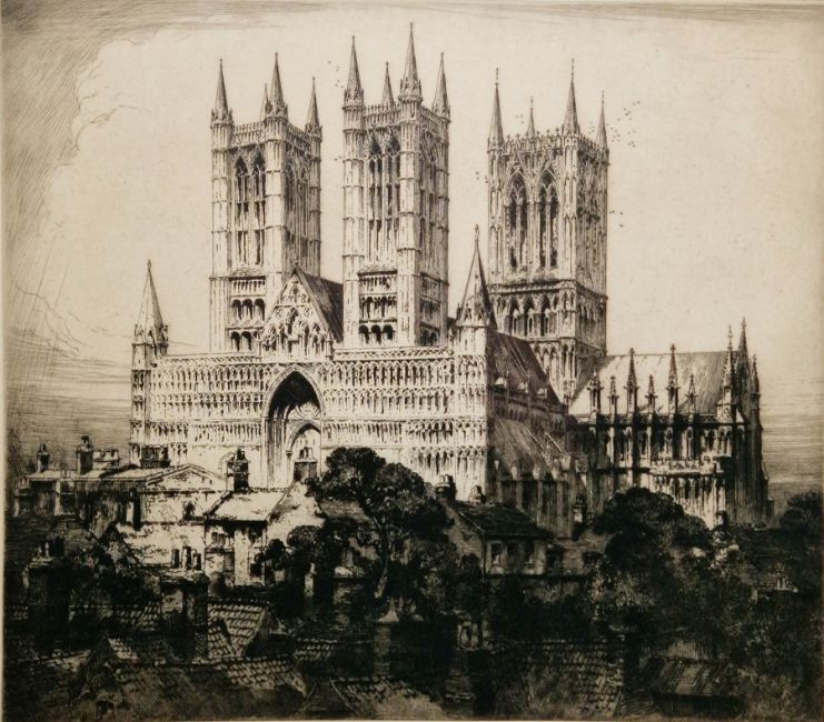 "Lincoln Cathedral", signed lower right, framed and glazed, mount aperture 34cm x 38cm, together with an etching depicting the interior of St. Lorenz Church, Nuremberg, indistinctly signed lower right, framed and glazed, mount aperture 58cm x 32cm (3)