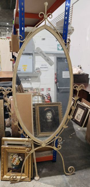 Contemporary oval-shaped white painted metal cheval mirror with leafy scroll supports and easel back (back support detached), 185cm high