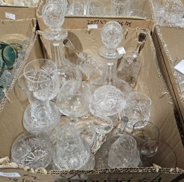 Quantity of cut and moulded glass including three decanters of different forms, Thomas Webb small tumbler, cut glass vase and other items (2 boxes)