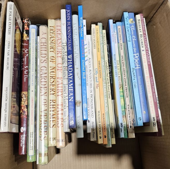 Quantity of modern publications children's books to include Orlando, various copies of the Wind in the Willows, Carol Lewis "Alicia en el Pais de las Maravillas", "Jonathan Swift' Gulliver", illustrated by Chris Riddell, Michael Forman "After the War was Over", Shirley Hughes, Chris van Allsburg, Helen Oxenbury, etc (3 boxes)