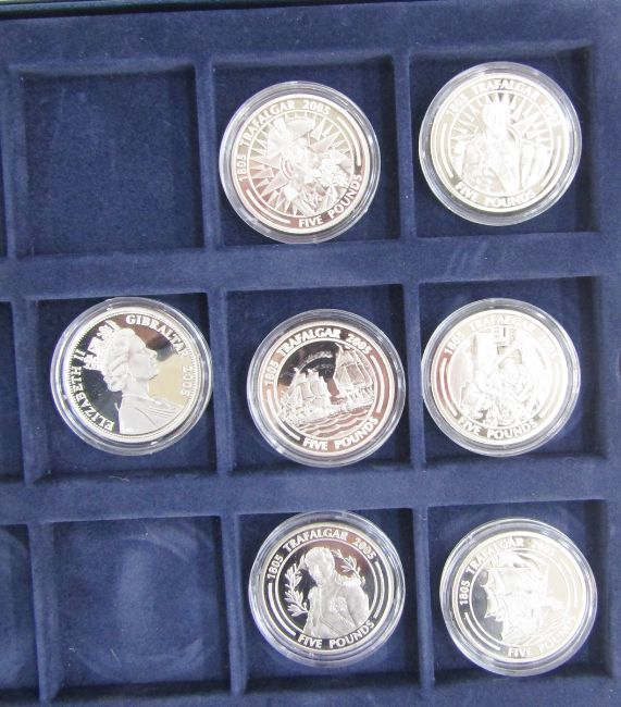 Group of silver proofs (16) from various Westminster coin sets, Battle of Trafalgar (7) with folder containing various certificates, Return to Athens (4) with various certificates, 60th anniversary of end of WWII (3) with various certificates, Pope John Paul (2) with certificates, all housed in 4 Westminster trays.