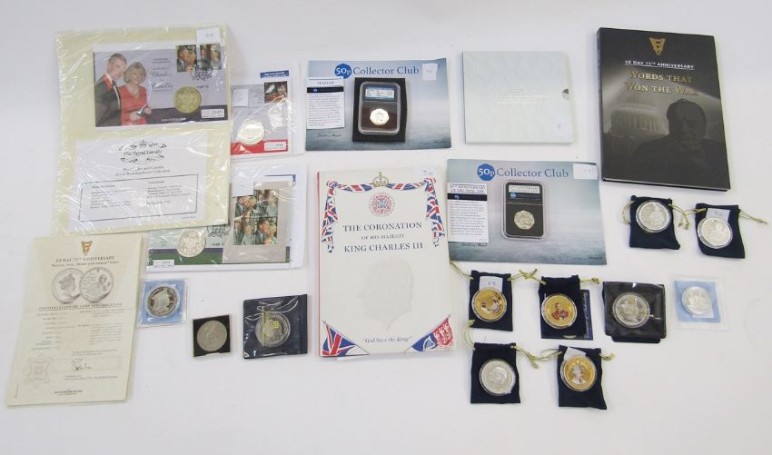 Collection (14) commemorative coins, (2) silver, Charles and Camilla first day cover with silver medal and Trooping of the Colour first day cover with silver £5 coin, with various other nickel or silver layered commemoratives, with (2) 2020/2021 slabbed 50p mule coin as produced for the Tokyo Olympics but as Games delayed was issued 1 year later, therefore coin has both 2020/2021 on coin, slabbed 50p commemorating 1971 decimalisation, 2007 brilliant uncirculated wedding crown (2) part-filled presentation packs, VE Day and coronation of Charles III