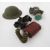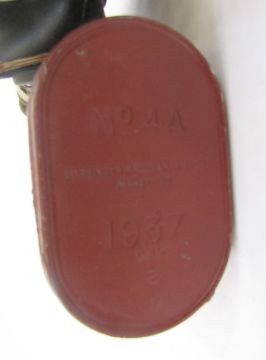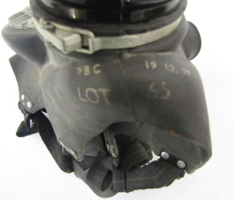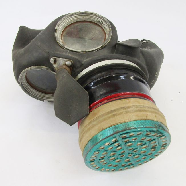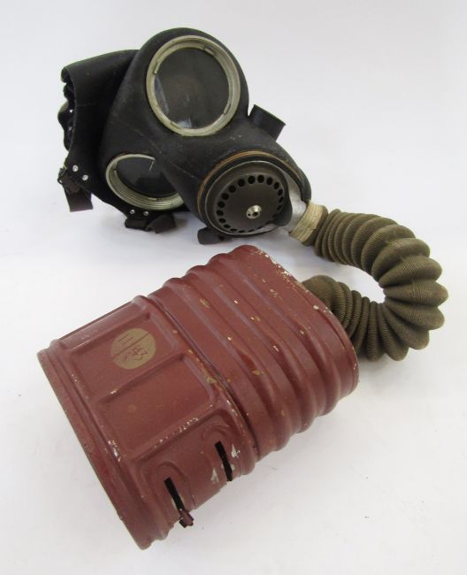 WWII Brodie style helmet, together with two WWII gasmasks.
