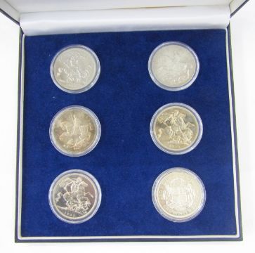 English milled crowns (6) in presentation box, (2) 1935 rocking horse crowns, (1) 1937 George VI crown, (3) 1951 George VI crowns