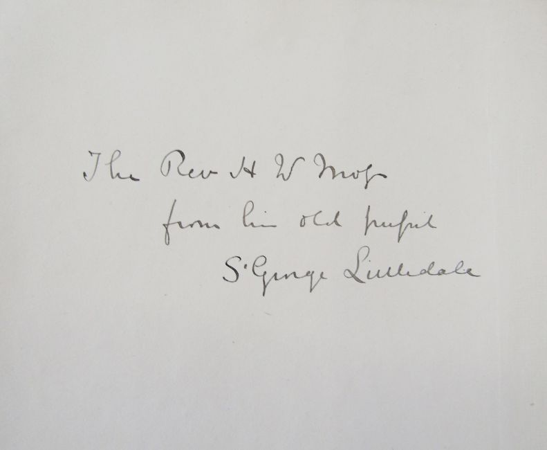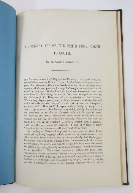 Littledale, St. George R. "A Journey Across Tibet, From North to South, and West to Ladak - from the Geographical Journal for May 1896" bound, half leather, rubbed, five photo ills., three maps, article from The Royal Geographical Society pastedown verso title page, inscribed and signed 'The Rev. H W. Moss from his old pupil St. George Littledale', "A Journey Across The Pamir From North to South" proceedings of the The Royal Geographical Society and Monthly Record of Geography January No. 1892, one folding coloured map, bound, half leather, shelf wear to the boards of both vols., inscribed and signed inside front board 'The Rev. H W. Moss from his old pupil St. George Littledale', shelf wear to both vols, gilt titles to the backstrips (2)