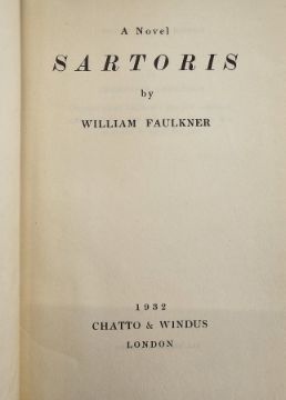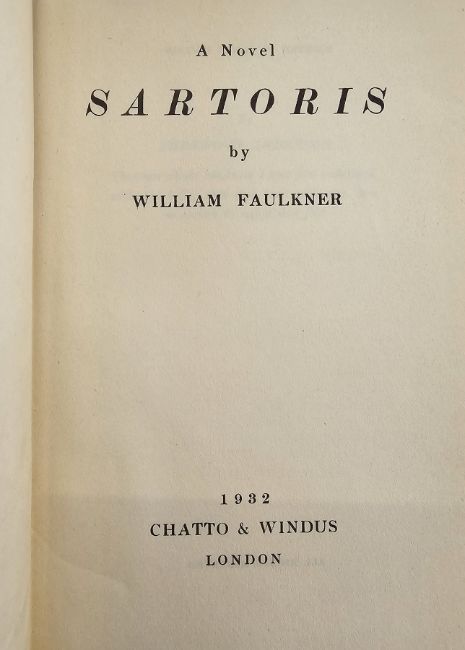 Faulkner, William "The Sound and the Fury" introduction by Richard Hughes, Chatto & Windus 1931 black cloth with red titles to the back strip dustwrapper for the Centaur Library, there is some loss to the back strip, "Sartoris" Chatto & Windus 1932, yellow cloth, red titles to back strip, Centaur Library dustwrapper but the back strip is missing and the whole is chipped with the loss, "Go Down Moses and other Stories" Chatto & Windus 1942 green cloth white titles, dustwrapper, price clipped and with some loss to the back strip, "As I Lay Dying" Chatto & Windus 1935 blue cloth, white titles, dustwrapper soiled and with loss (4)