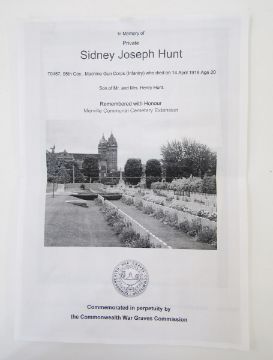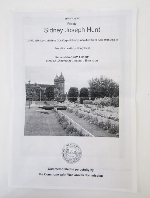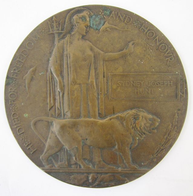 WWI family group of medals of local interest, WWI death plaque named 'Sydney Joseph Hunt', WWI war medal and victory medal named '24535.PTE.S.J.HUNT.GLOUC.R', WWI war medal and victory medal named to '19226.PTE.A.R.HUNT.GLOUC.R', WWI photograph. Sydney Joseph Hunt was killed in action 14th April 1918 aged 20. He served in the Gloucestershire regiment and Machine Gun Corps, born Birdlip, near Cheltenham, Gloucestershire.