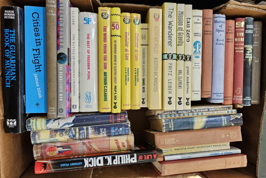 Science fiction, to include the Heinemann science fiction stories, Shiras Wilma "Children of the Atom"  T.V. Boardman & Co. Ltd 1954, ex libris with library stamps on ffep, there is staining to the initial pages on the hinge and corners, black cloth with silver title, original dustwrapper, not price clipped and with a facsimile wrapper, Derleth August "The Other Side of the Moon" Grayson & Grayson 1956, inked name dated 1958 on ffep blue cloth, dustwrapper, not price clipped, small sellotape repairs, Pohl Frederik and Kornbluth CM "The Space Merchants" William Heinemann 1955, inked name on ffep blue cloth, dustwrapper, not price clipped, with facsimile wrapper, Slone William "Stories for Tomorrow" Eyre & Spottiswoode 1955, inked name inside front board, offsetting on ffep, blue cloth, dustwrapper, not price clipped, with facsimile wrapper, Gollancz science fiction series, four volumes to include Arthur C Clarke, Phillip K Dick, Frederik Pohl, Schuyler Miller P "The Titan" Weidenfeld & Nicholson 1952, inked named ffep, red cloth, dustwrapper, not price clipped, Patchett M.E. "Lost of Venus..."  Lutterworth Press London 1954, colour frontis, pale yellow cloth, dustwrapper, not price clipped, with glassine cover, some loss, Russell Eric Frank "Deep Space" Spottiswoode 1956, original dustwrapper, with facsimile wrapper and numerous other related volumes (1 box)