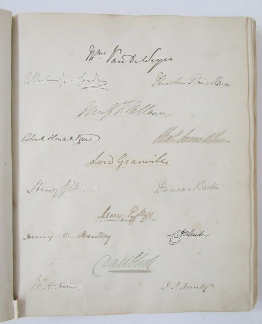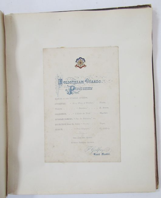 Royal Interest - A Victorian album containing programmes for musical evenings at Buckingham Palace, embossed with the Royal Coat of Arms, dating from 1867 to 1887, with Victorian  'scraps', Christmas and other cards, also various early photographs to include The Royal Yacht Club Hotel, Isle of Wight, 'Wreck of the Eurydice', town scenes etc., marbled endpapers, quarter leather but the whole very rubbed and loose