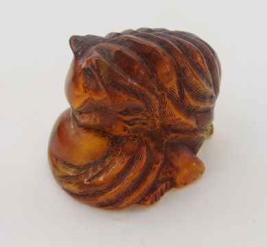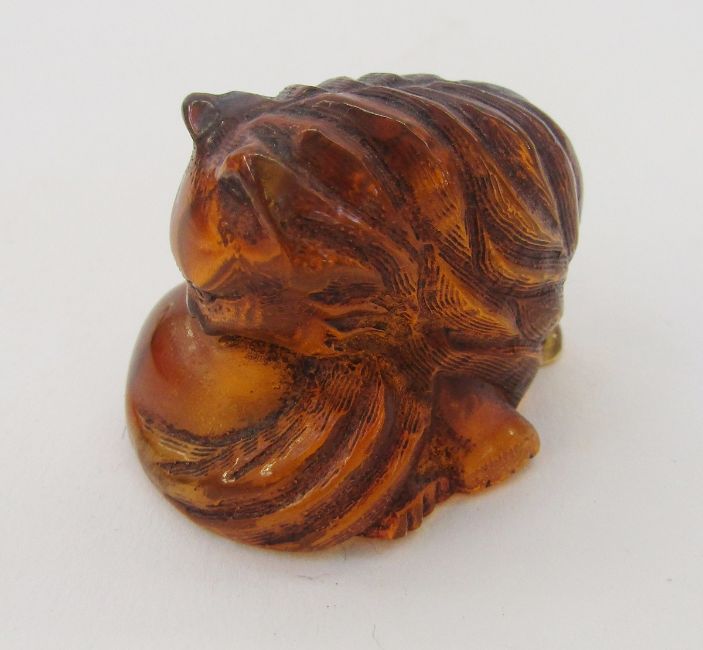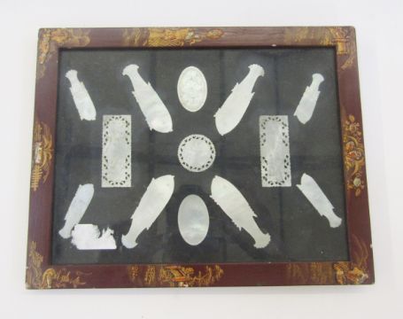 Japanese carved amber netsuke in the form of a fox, 2.5cm high, and a small collection of Asian mother-of-pearl engraved gaming counters in chinoiserie lacquered rectangular frame, 23.5cm high (2)
