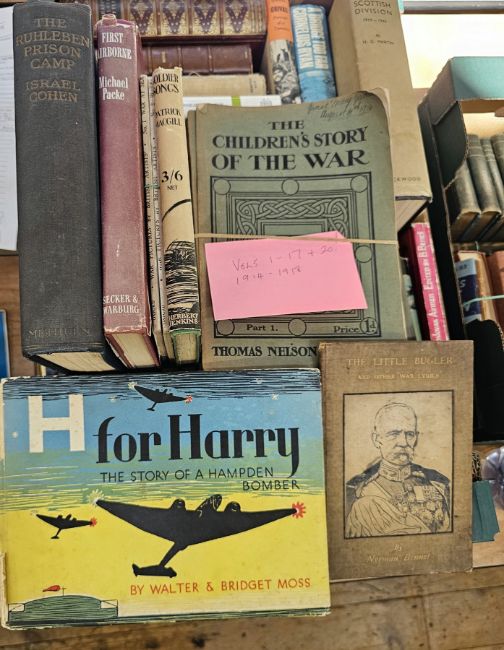 Rowe, R P P "A Concise Chronicle of Events of the Great War", Philip Allen & Co 1920, fine binding, half calf with brown marbled boards, gilt titles, Creasy, Sir Edward "15 Decisive Battles of the World from Marathon to Waterloo", Macmillan 1901, prize binding for the South Wales Training College, full leather, front board is detaching, marbled boards, Martin, H G "History of the 15th Scottish Division 1939-1945", William Blackwood & Sons 1948, numerous photographic illustrations, coloured folding plates, map ep, black cloth, d-w, Masefield, Sir Peter G "To Ride the Storm", William Kimber, Churchill, Winston S "Step by Step 1936-1939", Macmillan & Co 1942, d-w, Packe, Michael "First Airborne", Secker & Warburg 1948, d-w, Bennett, Norman "The Little Bugler and Other War Lyrics", pictorial boards, photographic illustrations, board rather soiled, MacGill, Patrick "Soldier Songs", Herbert Jenkins 1917, d-w, Cohen, Israel "The Ruhleben Prison Camp, a Record of 19 Months Internment", Methuen & Co (1916), photographic frontis, illustrated front ep, photographic illustrations, some slight foxing, blue cloth, boards rather bent and other volumes (1 box)