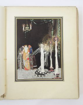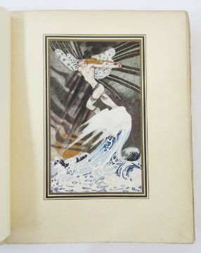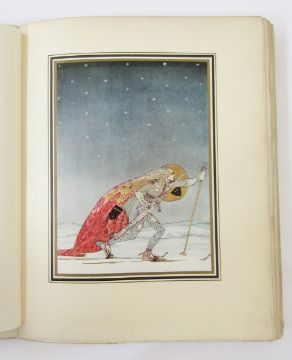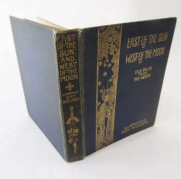 Nielsen, Kay (ills.)  "East of the Sun and West of the Moon - Old Tales from the North",  Hodder and Stoughton [1914], all tipped col plates as listed present, the frontis plate is nearly loose and the lettered tissue guard is creased with a small tear, the hinges are cracked and the whole cocked, some finger marks on title page and preface, original blue publisher's cloth with pictorial gilt decoration and titles to front board and backstrip, the backstrip is pulled top and base, the corners rubbed with some loss - further comments - please see additional images , also the hinges are separating through the book, finger marks on edges of  other plates