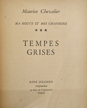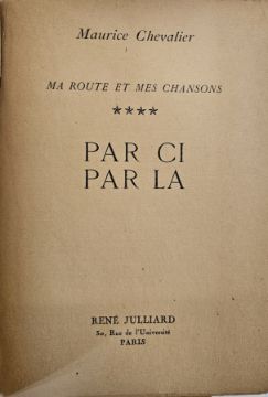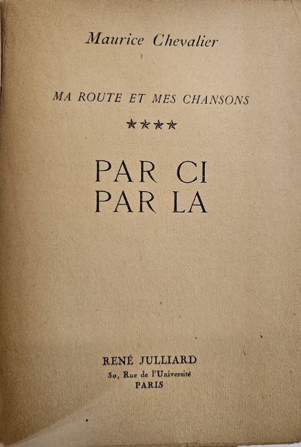 Chevalier, Maurice, 3 vols of "Ma Route et Mes Chansons" 1946, 1948 and 1950, published by Rene Julliard, Paris 1946, 1948 and 1950, all signed by Maurice Chevalier and the 1946 vol is dedicated and signed across the tp, limp covers which are rather chipped (3)