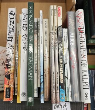 Steadman, Ralph - illustrator "Gonzo v Art" signed in red and black biro by the illustrator all over the title page Weidenfeld & Nicholson 1998, red cloth, dustwrapper, not price clipped, Thompson Hunter S and Steadman, Ralph "The Curse of Lono", signed with a doodle in gold pen by the artist, dated 19th December '84 on the ffep, laminated boards, Damjan, Mischa & Steadman, Ralph "The False Flamingoes" Dennis Dobson 1968, signed in gold pen, 19th December '84, and also in blue biro over the gold pen on the title page, orange cloth, dustwrapper, Stone Bernard and Steadman Ralph "Inspector Mouse" Andersen Press London 1980, signed in red biro by the author and red ink by the artist, 15th October '84, laminated boards, "Emergency Mouse" Andersen Press 1978, signed in red biro by the author and red ink with a doodle by the artist dated 15th October '84, laminated boards, Steadman, Ralph "Between the Eyes" Jonathan Cape 1984, signed in green pen by the author with a doodle dated 15th October '84, blue cloth, dustwrapper, Steadman, Ralph "I, Leonardo" Jonathan Cape 1983, signed in gold pen by the author dated 19th December '84, green cloth, dustwrapper, and Mitchell, Adrian "Who Killed Dylan Thomas?", illustrated by Ralph Steadman, signed by Ralph Steadman in black and red biro all over the title page, published 1988 Ty Lien Publications, folio limp pictorial covers, and various other titles illustrated by Ralph Steadman, and "Scarfe on Stage" published by Hamish Hamilton 1992 introduction by Sir Peter Hall, dustwrapper (1 box)