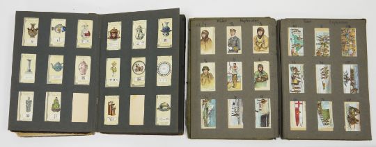 Two early 20th century cigarette card albums containing various part sets of loose cigarette cards, including Players Colonial and Indian Army Badges, Players Polar Exploration, Players Ships Figureheads, Wills Napoleon, Wills Allied Army Leaders, Wills First Aid and others