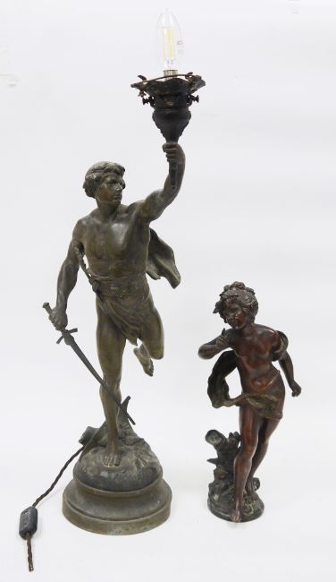 After Emile Louis Picault (French 1833-1915) bronzed spelter table lamp titled 'Victoria', impressed marks, 64cm high and after Auguste Moreau (French) bronzed spelter sculpture of a young girl, 35cm (2)  Provenance: from the collection of Darrin Baines, Professor of Health Economics.  Professor Baines filled his early Victorian townhouse in Leominster, Herefordshire, with Georgian and Victorian apothecary objects collected over a period of 20 years.  Darrin Baines, researcher and consultant, has produced health economics and health policy projects and contributed articles to numerous academic and trade journals. Some pieces in the collection were bought from a Victorian pharmacy in Upwell, The Fens, others from pharmacists across the country, from auctions in the UK and on the continent.