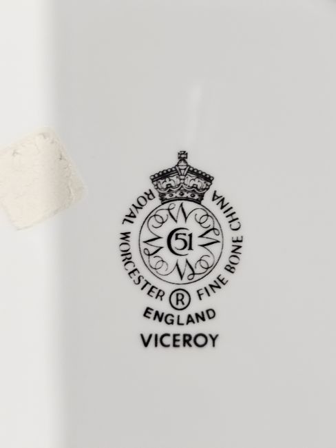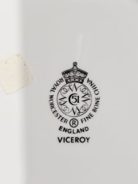 Royal Worcester bone china Viceroy pattern white and gilt part dinner service with six settings, printed black marks, comprising a circular two-handled vegetable tureen and cover, dinner plates, side plates, supper crescent-shaped dishes, sauceboat and stand, soup cups, stands, coffee cups, coffee pot and cover, milk jug, sugar bowl and cover and a Royal Worcester fine bone china tableware 1992 brochure