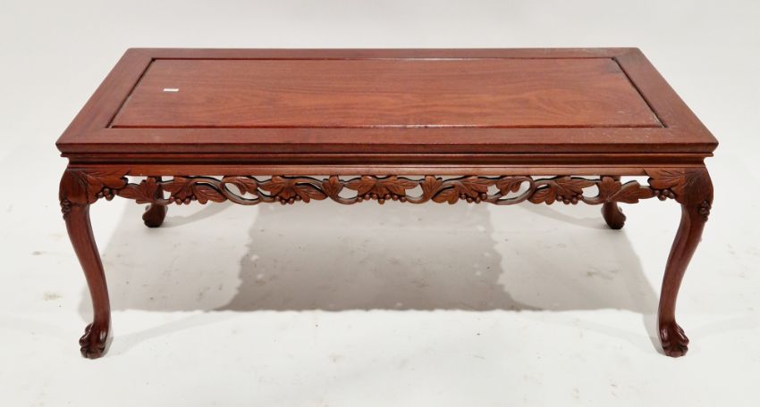 Chinese hardwood coffee table, the rectangular top over a pierced carved frieze in the form of leaves and berries, on cabriole legs with ball and claw feet, 40cm high x 102cm long x 47cm wide