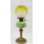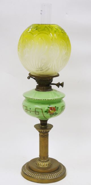 Victorian oil lamp having a green tinted etched glass shade, a green glass well with floral painted decoration, on a brass column base with circular foot, with chimney, 64cm high  Provenance: from the collection of Darrin Baines, Professor of Health Economics.  Professor Baines filled his early Victorian townhouse in Leominster, Herefordshire, with Georgian and Victorian apothecary objects collected over a period of 20 years.  Darrin Baines, researcher and consultant, has produced health economics and health policy projects and contributed articles to numerous academic and trade journals. Some pieces in the collection were bought from a Victorian pharmacy in Upwell, The Fens, others from pharmacists across the country, from auctions in the UK and on the continent. Condition Report Shade condition :- Chip to underside, some wear around the top. Few scratches and marks around the shade. Please see further images.