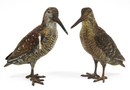 In the manner of Franz Bergman, pair of Austrian style cold-painted bronze models of snipes or woodcocks, 14cm high