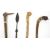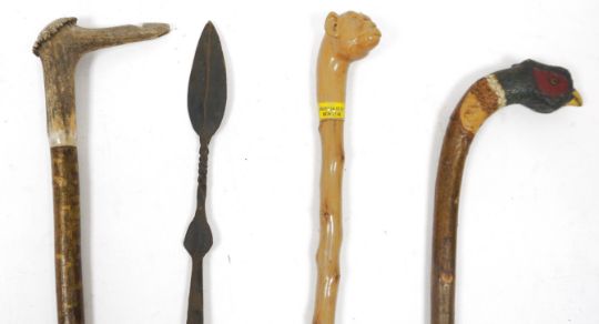 Leather stickstand in the form of an artillery shell carrier, 50cm high together with a quantity of walking sticks, spears and umbrellas including a carved monkey head walking stick, carved and painted pheasant head walking stick, carved snake handled walking stick, hardwood tribal African carved walking stick, two spears and others