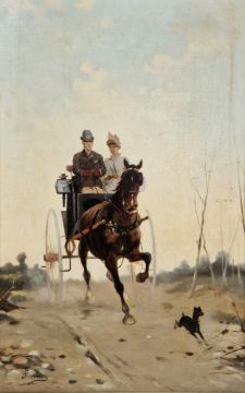 , with lady and gentleman in a carriage, signed lower left, 58.5cm x 37 cm